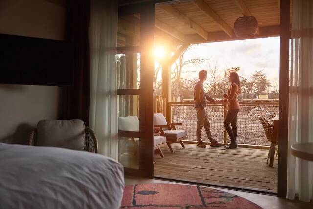 In Safari Hotel Beekse Bergen, you wake among the wild animals. Enjoy your luxury hotel room, watching zebras, giraffes and rhinoceros wander by while sipping a cup of coffee in the morning. Indulge in a delicious meal at one of the two restaurants or relax on the patio.